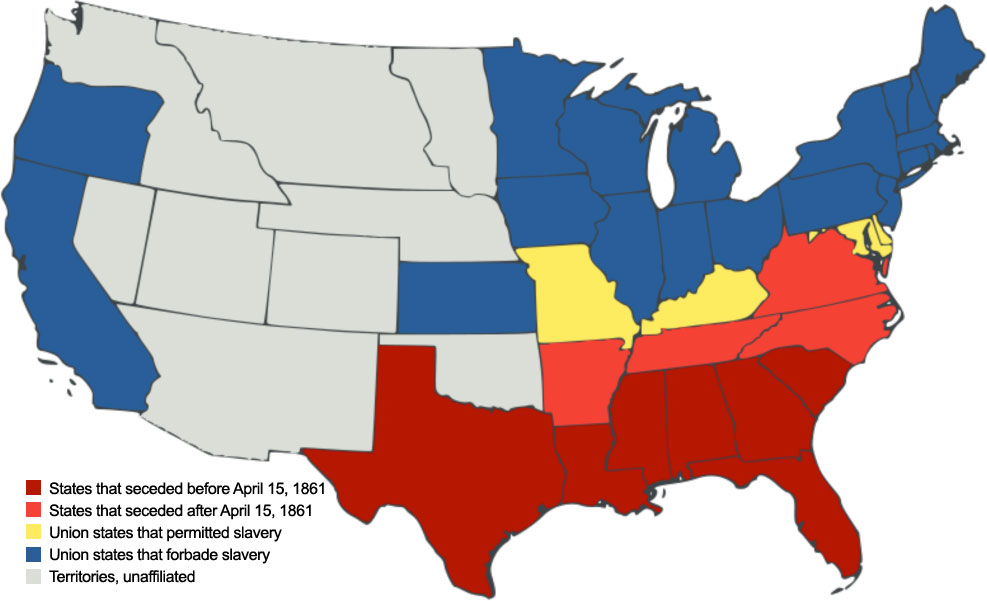 While many reasons have been presented for the reasoning behind the war, slavery remains a constant source of tension. Great political division existed in the United States over representation of the Southern states for their ideals of slavery, possession, trade, state’s rights and regional legislation that upheld those beliefs. The threat of southern secession had been on the political table for some time, but the election of Abraham Lincoln in 1860 provided a catalyst for Southern secession that sparked an almost unstoppable road to war. The South felt that Lincoln would bring a halt to the slave trade and its expansion further westward. South Carolina triggered a domino affect of states leaving the Union, and by 1861 most of the Southern states had ceded from the United States.